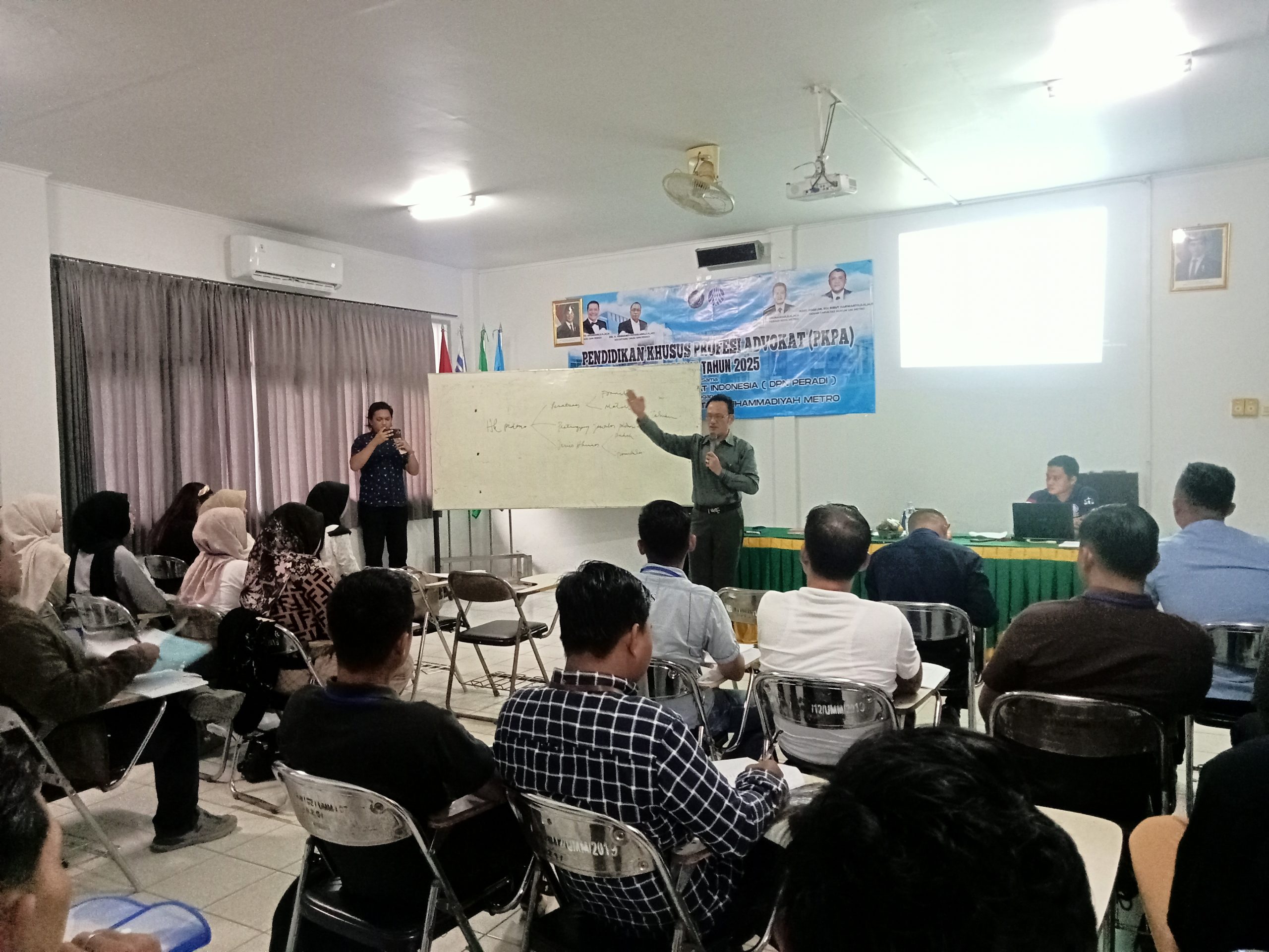 Samudranewstv- Metro- Para Peserta Pendidikan Khusus Profesi Advokat (PKPA) mendapatkan Materi dari Ketua DPC Peradi Kota Metro. Yang berlangsung di Gedung Fakultas Hukum Universitas Muhammadiyah Kota Setempat, 20-9-2025.